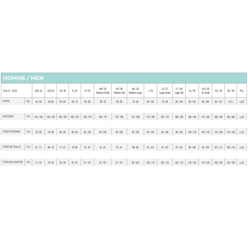 | Taille | XS, S, M, ML, L, XL, XXL, XXXL, MT, LS, LT, MLT, MS, MLS |